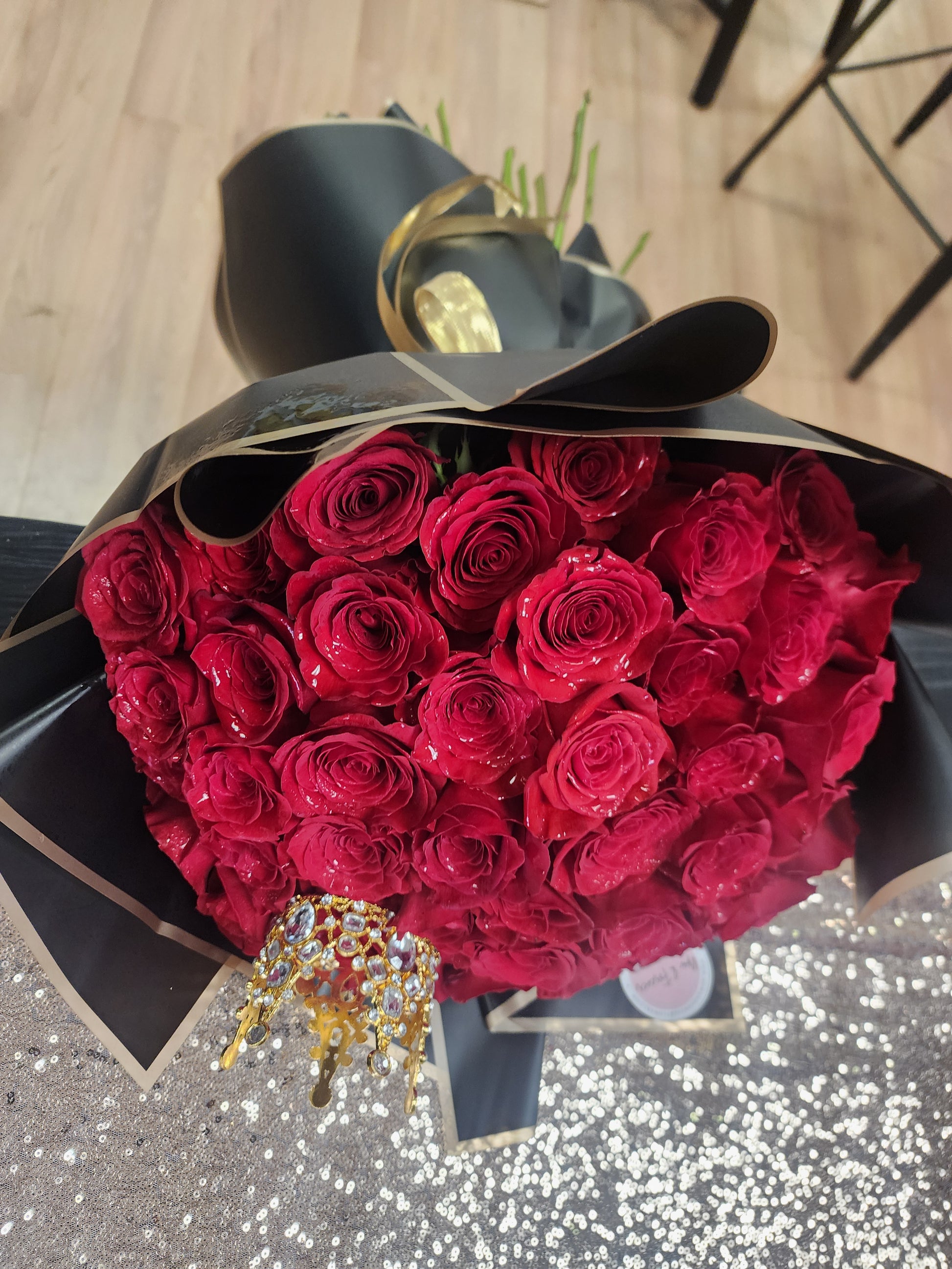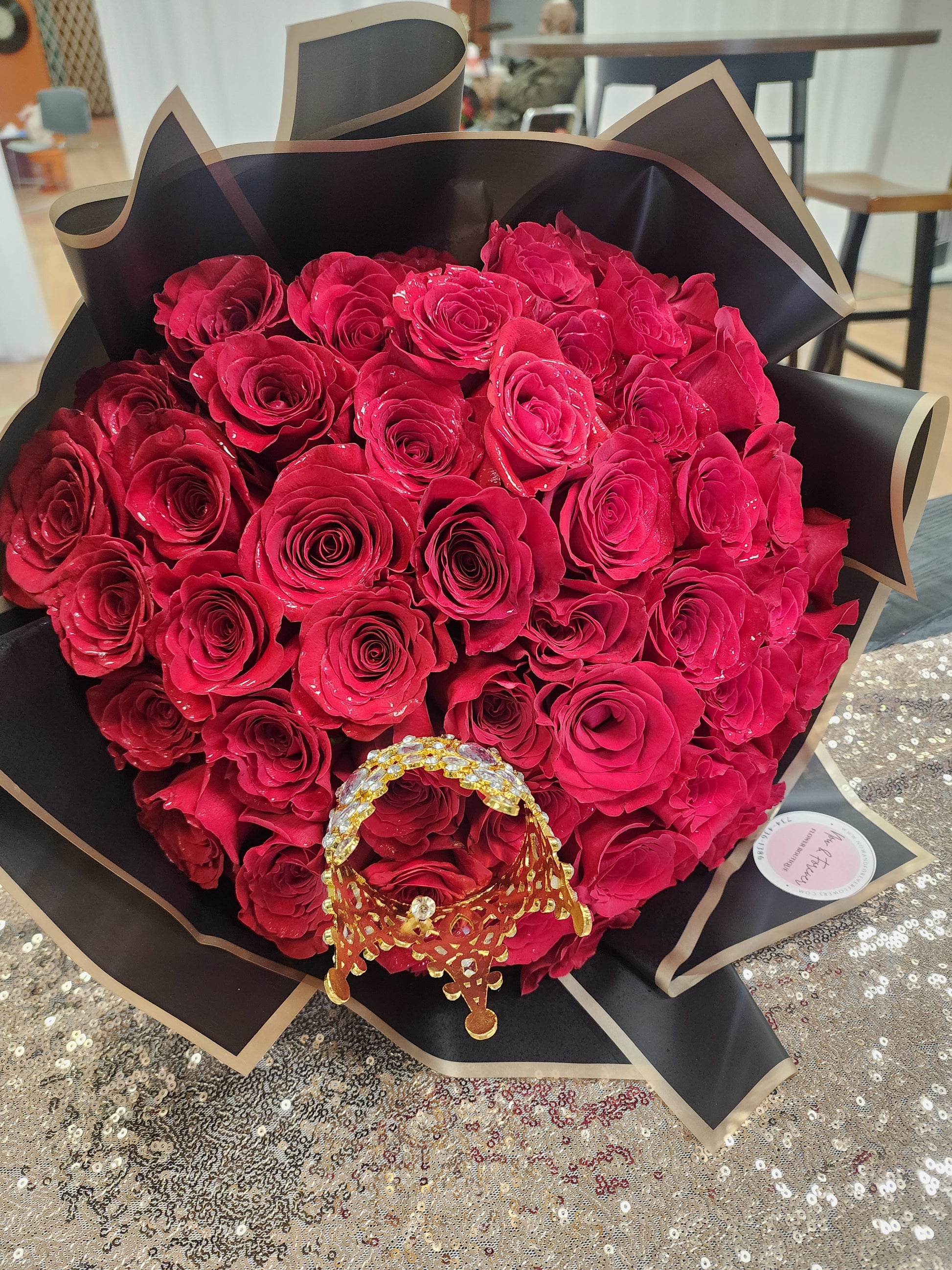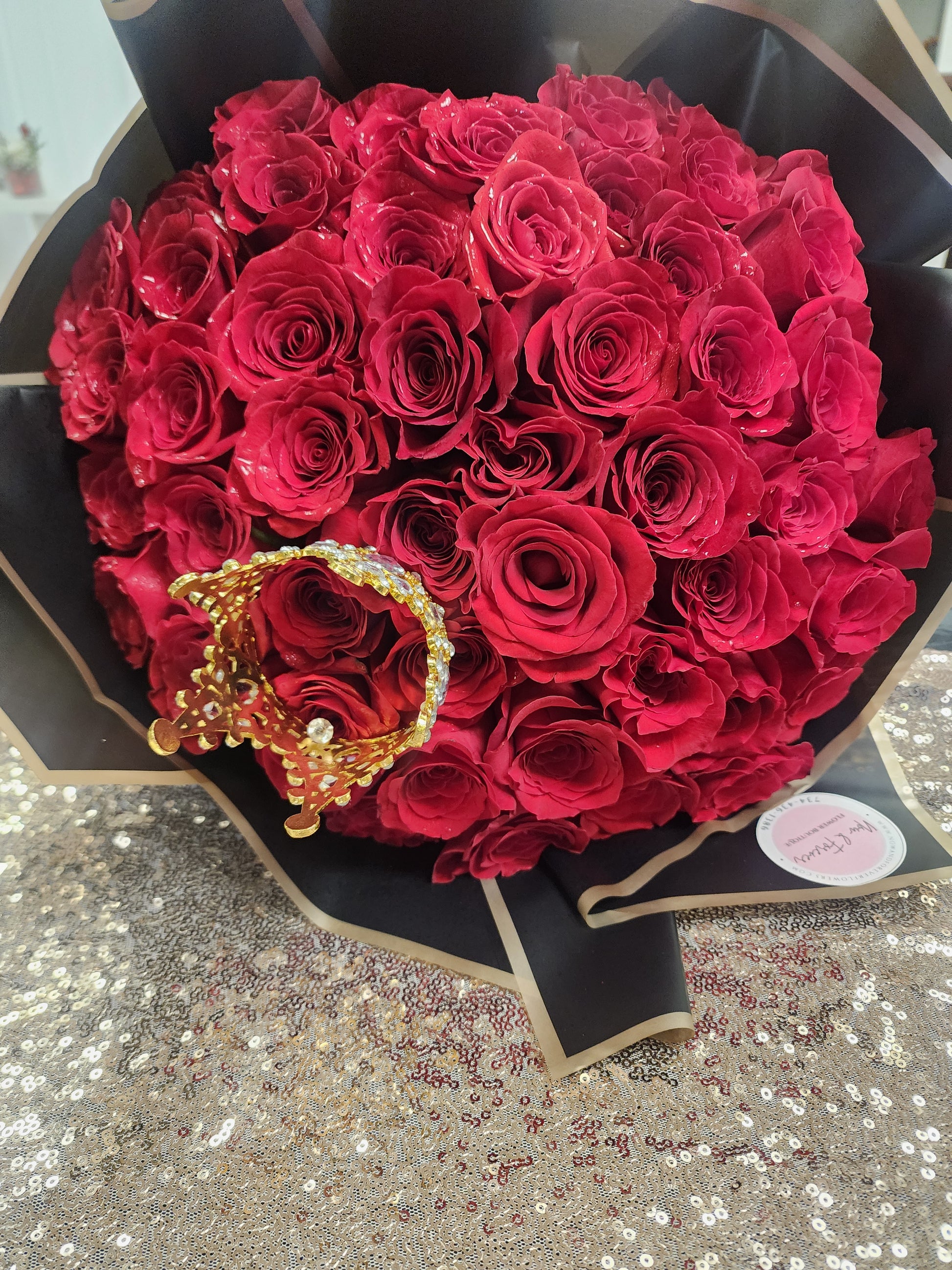 Surprise your loved one with our Luxury Rose Crown Wrapped Bouquet! Featuring 50 or 100 long stem luxury roses, hand-tied and arranged into a stunning crown, this bouquet is the perfect way to say "I love you". Choose from a variety of rose colors, all wrapped in waterproof floral paper for long-lasting beauty. Order now, supplies are limited!