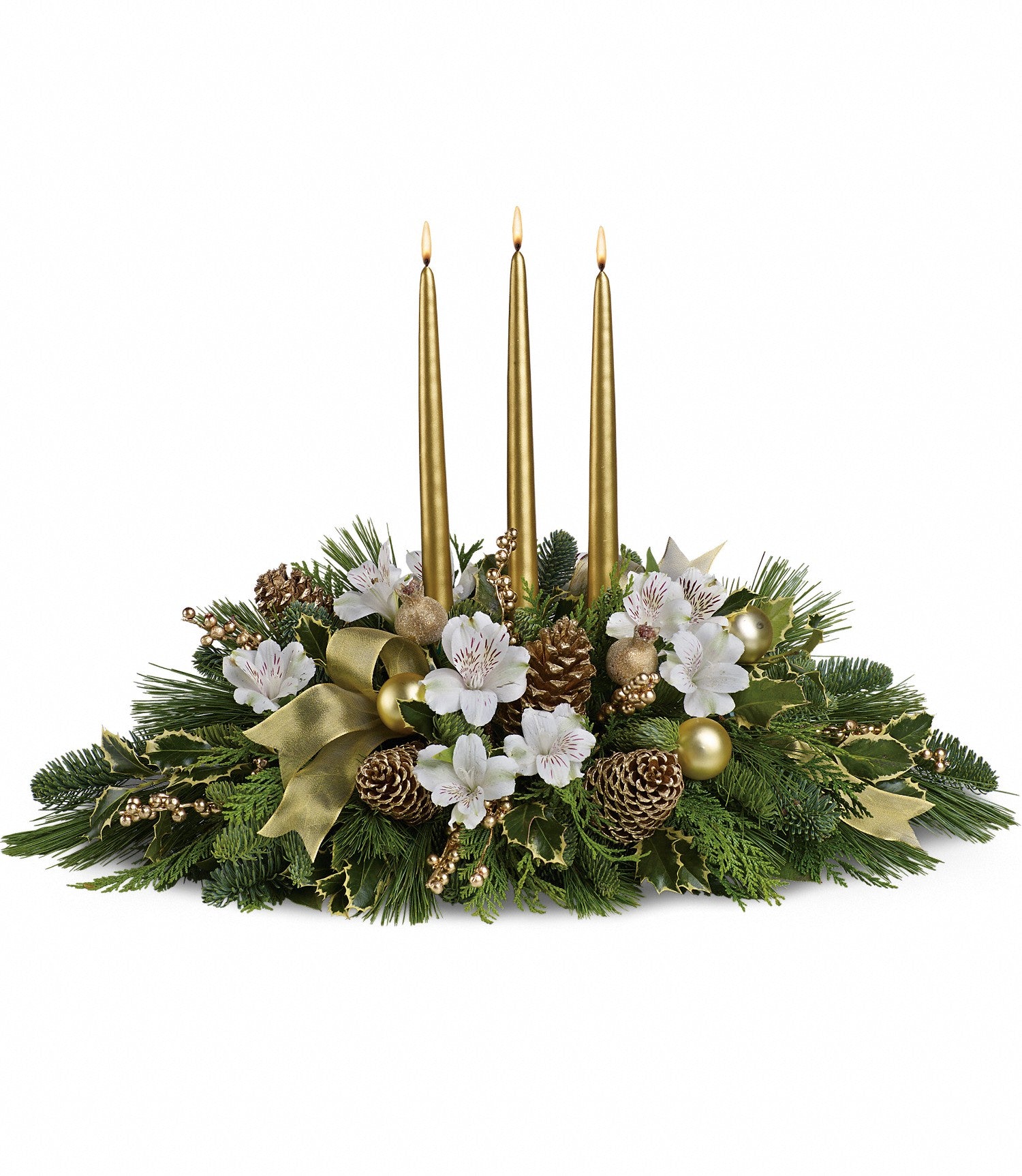 Three gorgeous gold taper candles take center stage in an arrangement of crème roses and spray roses, white alstroemeria, gold ornaments, pinecones, intricate mesh ribbon, Christmas greenery and more. This kind of high style really is fit for a king or queen!