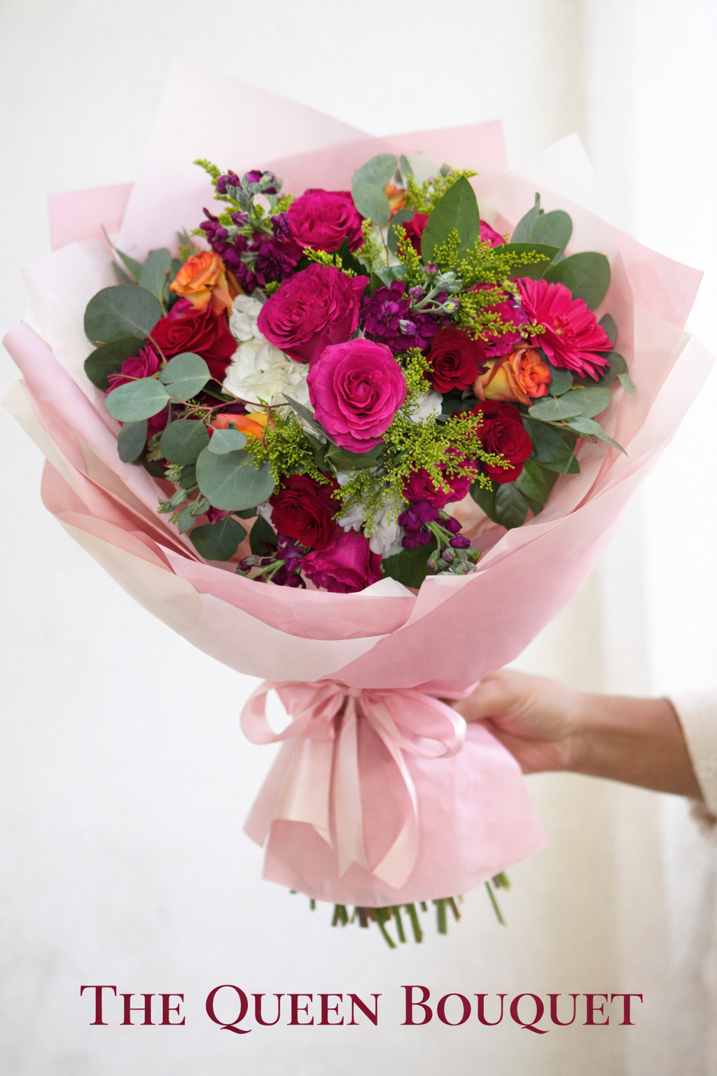 Featuring a lush mix of premium roses, seasonal blooms, and fresh greenery, this bouquet is carefully hand-wrapped in elegant pink and white paper to create a luxurious presentation fit for a queen.